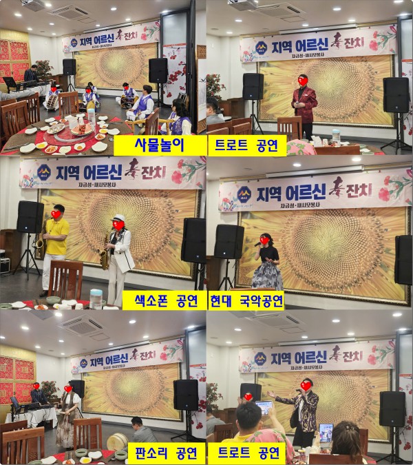 어르신들의 흥을 북돋아 줄 사물 놀이, 판소리, 색소폰 연주, 지역 트로트 가수 초대, 현대 국악공연 등 다채로운 공연을 시작으로
